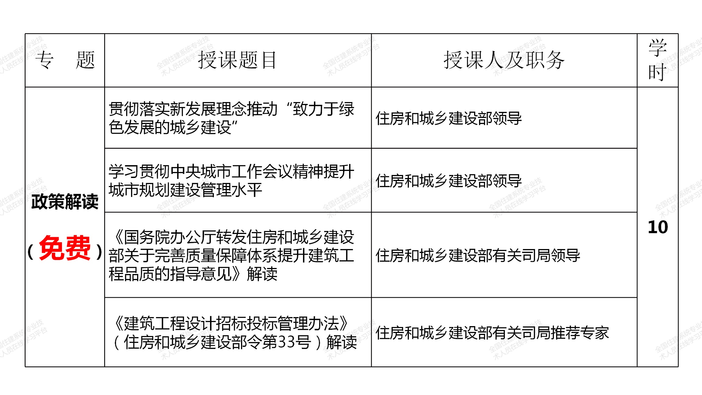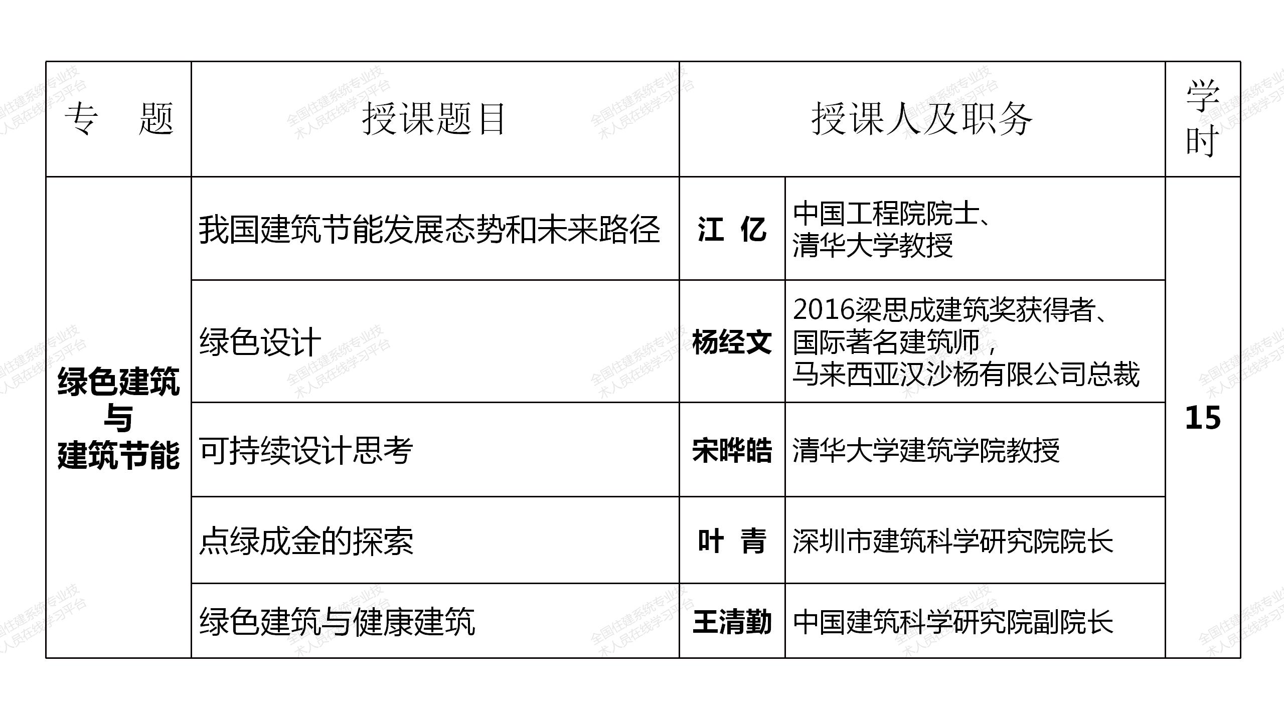 網絡選修課程由中國工程院院士、全國工程勘察設計大師和建筑領域著名專家、住房和城鄉建設部有關領導主講,分政策解讀、城市設計與城市品質提升、建筑創新與文化傳承、綠色建筑與建筑節能、智能建造與建筑工業化和建筑防火設計6個專題共85學時(見附表),注冊建筑師可根據自身需要選擇其中40學時學習,其中10學時的政策解讀專題課程免費提供,并可計入繼續教育學時。課程緊密結合國務院、住房和城鄉建設部近年發布的有關行業改革、裝配式建筑、建筑工業化、智能建造等重大政策,緊跟國家形勢發展需要,是一套集權威性、系統性、針對性、實效性于一體的建筑領域頂尖課程。選修課程于2021年7月12日在“全國住建系統專業技術人員在線學習平臺”(http://www.mayortraining.net)正式上線。